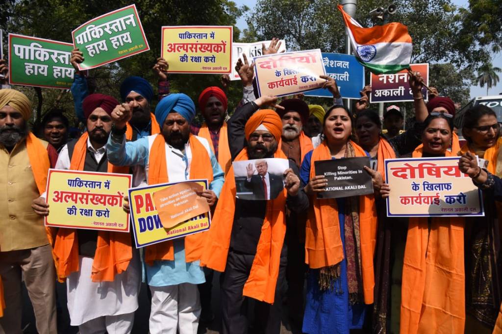 पाकिस्तान में रह गए हिंदू, सिख, ईसाई, हाजरा व अहमदिया अल्पसंख्यकों के विरुद्ध हिंसा, नाबालिग अल्पसंख्यक कन्याओं के अपहरण, बलात्कार, धर्मांतरण एवं जबरन विवाह तथा अल्पसंख्यकों के धर्म स्थानों पर हमले लगातार जारी हैं इसको लेकर नेशनल अकाली दल के राष्ट्रीय अध्यक्ष परमजीत सिंह पम्मा भारत यात्रा पर आ रहे अमेरिका के राष्ट्रपति श्री डोनाल्ड ट्रंप से पाकिस्तान के खिलाफ कार्रवाई करने की मांग को लेकर जंतर-मंतर पर मार्च निकाला।