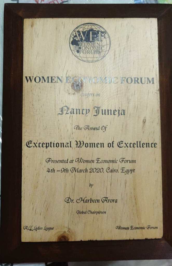 Nancy Juneja has been conferred by the highest civilian honour by the United Nation- The Karmaveer Chakra in 2019 and has also featured as “Woman Entrepreneur if the year” by International Educational Icon in Delhi, India