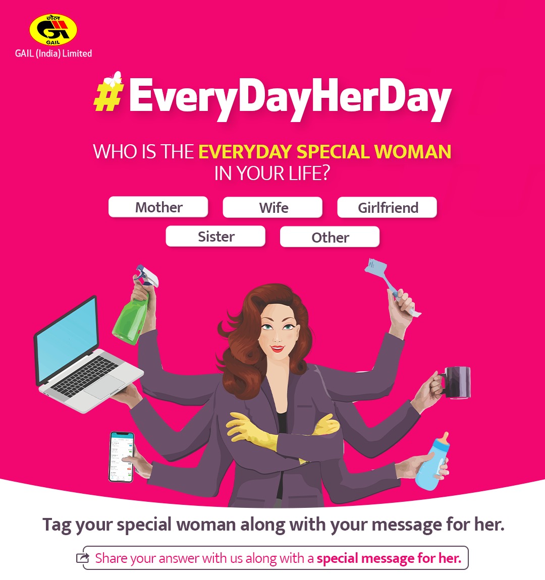 A video was launched by GAIL on its social media platforms with the hash tag #EveryDayHerDay showcasing how woman are an important part of our lives every day. Women across all GAIL offices participated in the video and portrayed the various aspects of their lives and their contributions. Social media activation was also integrated along the video asking netizens to tag their special woman along with their special message to her.