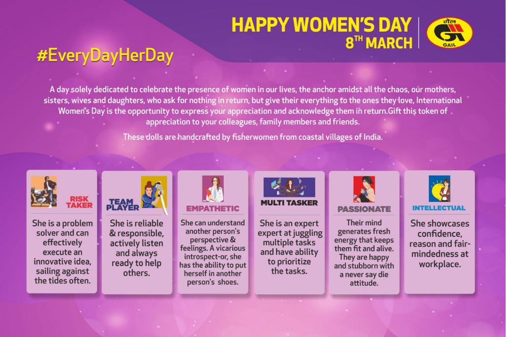 GAIL employees had an option to choose from six different gift categories namely “Passionate”, “Team Player”, “Risk Taker”, “Empathetic”, “Intellectual” and “Multitasker”. They can choose their gift in the form of doll, handcrafted by fisherwomen from coastal villages of India, along with the respective message categories as a token of appreciation to their female colleagues, family members and friends for their skills, efforts and qualities.